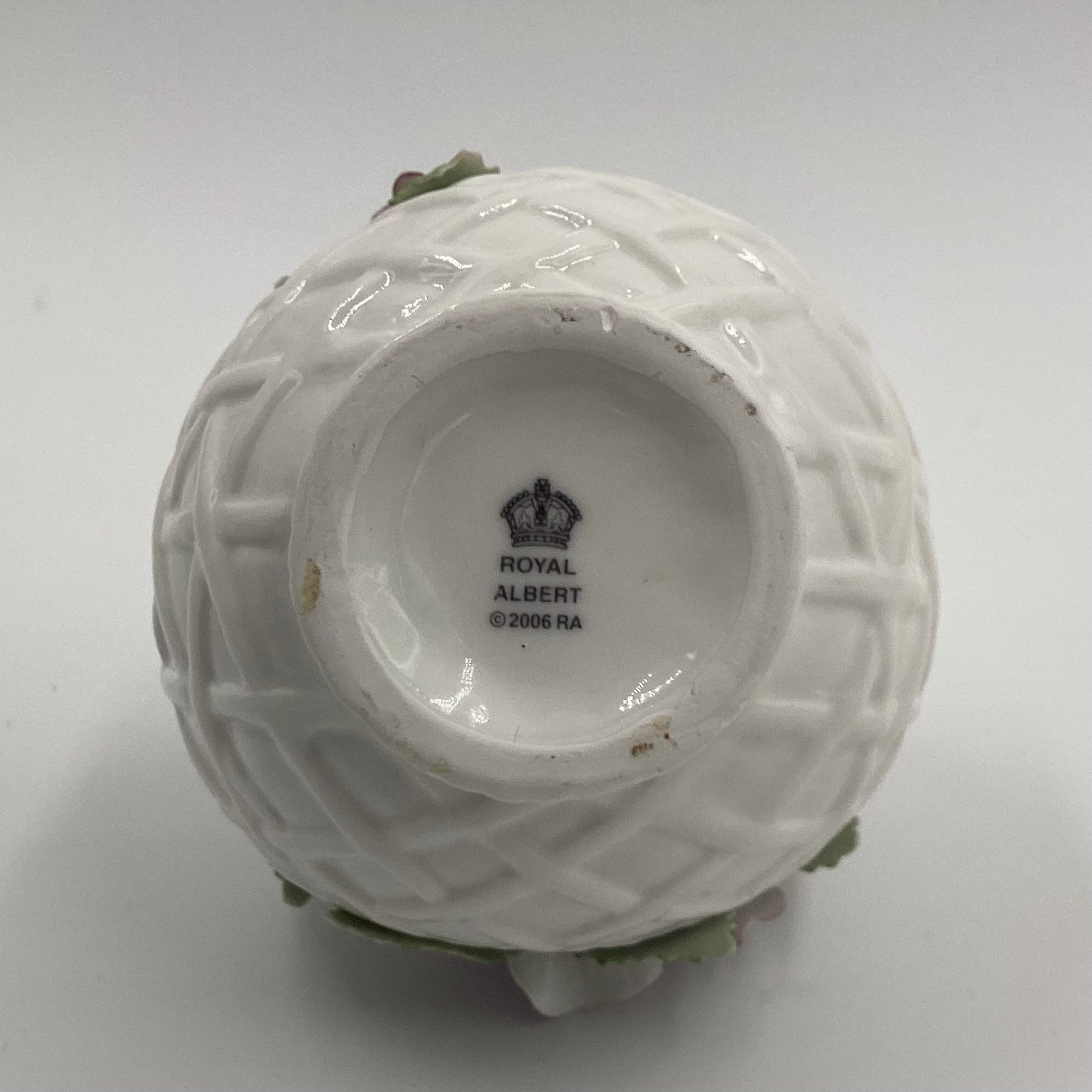 The Porcelain Flower Bouquet features a hand-modeled and painted design by Royal Albert, capturing timeless beauty. Measuring 3 inches wide and 4 inches tall, it adds a delicate touch to any decor. Despite a minor flaw with one broken petal, its charm remains intact, making it a unique collectible piece.