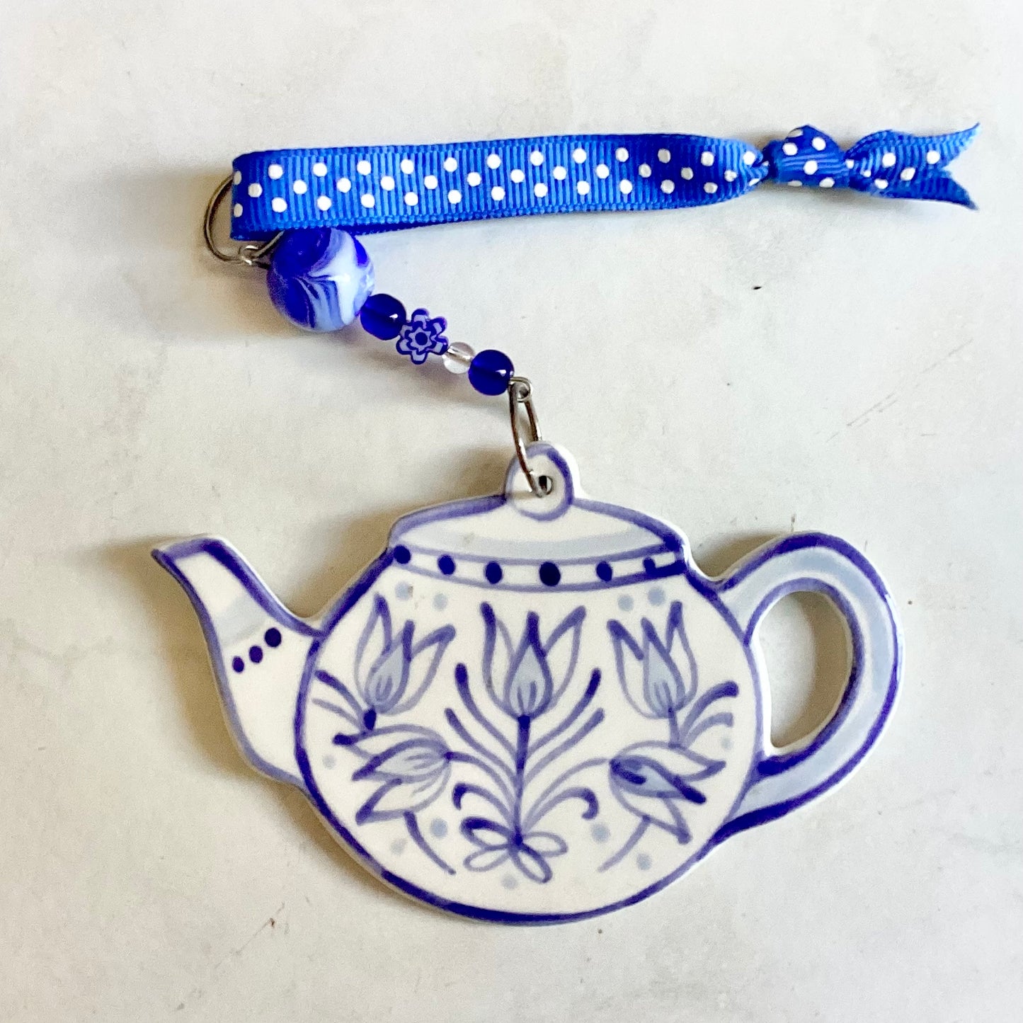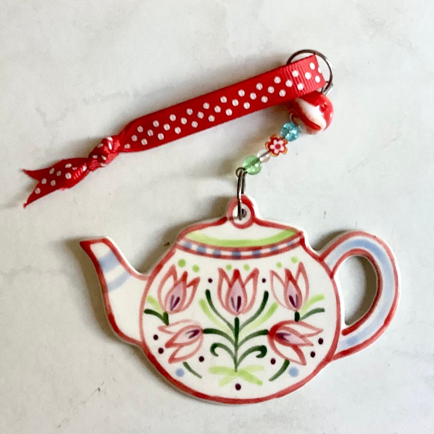 Handmade and hand painted porcelain teapot ornaments.